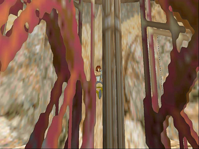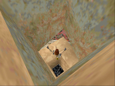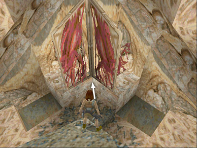 To reach the level exit far below without losing any health, try this simple but not exactly "legal" variation on the fence bug. Position Lara at the corner where the two red lattice panels come together, indicated by the arrow in the screenshot above.