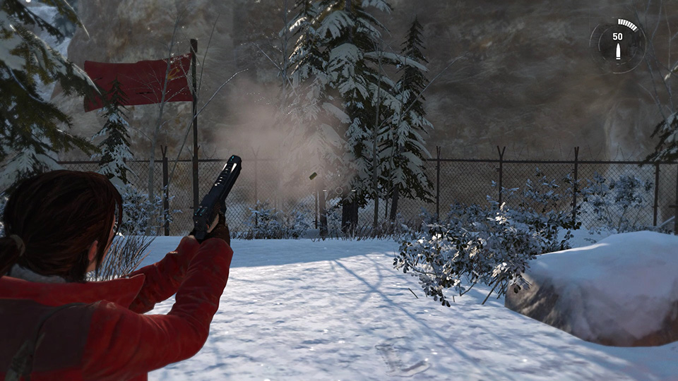 Lara can pick up small items like cans or bottles and throw them to distract enemies. Distraction is introduced early in the Soviet Installation. Press Interact to pick up the object. Hold Aim and you'll see a white arc, showing the trajectory the object will take. Use the right stick/mouse to aim. Then press Fire to toss the object. (Or press Drop/Dodge to drop the item if you change your mind.) The same mechanics are used for throwing improvised explosives (above). |