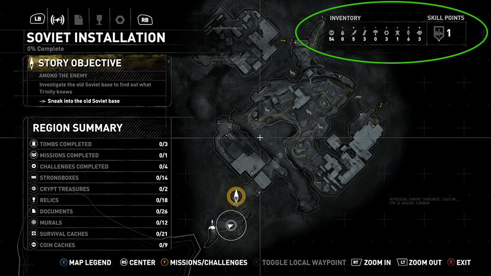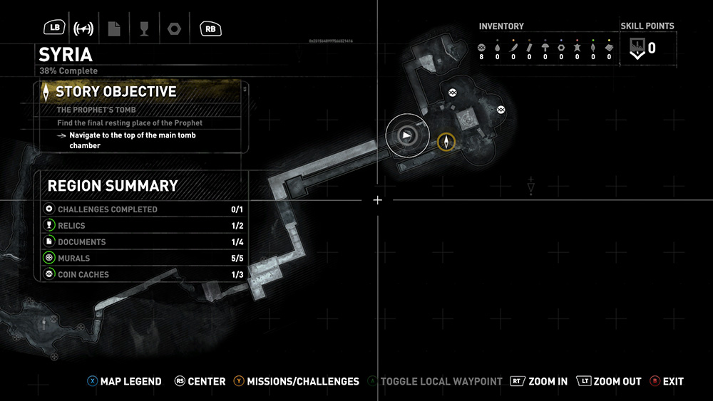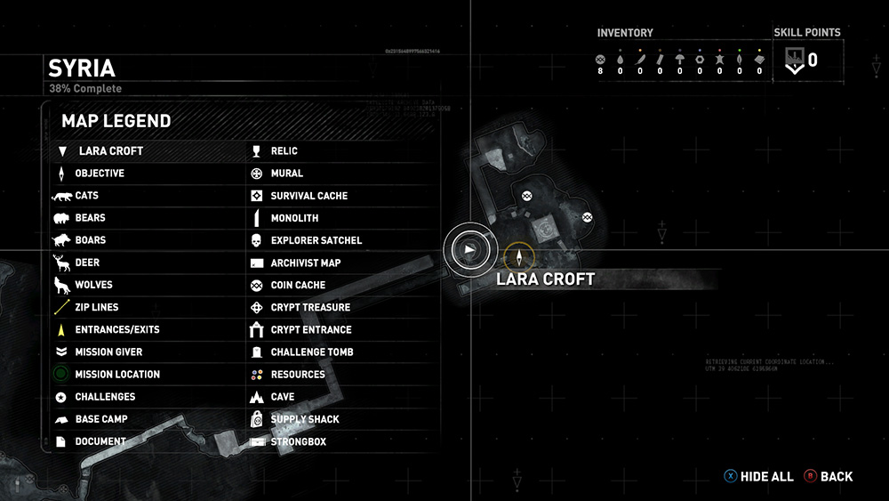 Once Lara has moved close to them, Base Camps, major collectibles, and other points of interest—such as Crypt and Challenge Tomb entrances—will be marked on your map. Unlocking certain skills and finding certain objects will mark some of these items on the map beforehand, making finding them much easier. (See Collectibles, below.)