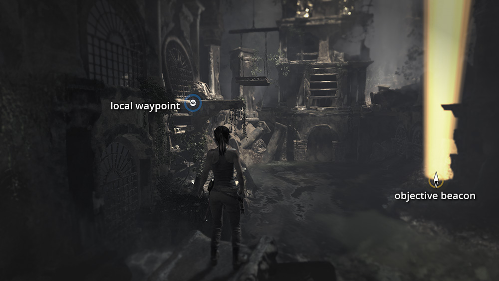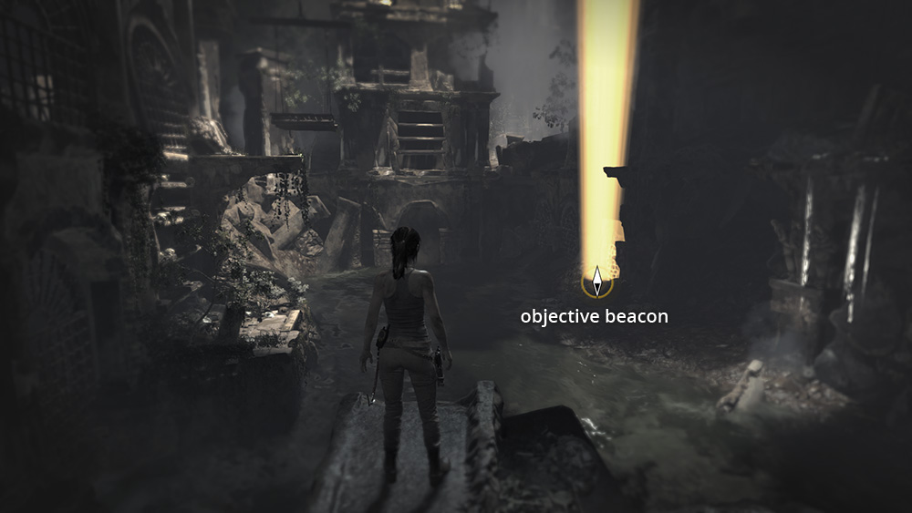 Press to highlight objects in the environment with which Lara can interact and to show the current Objective Beacon, a beam of light shining down from the sky indicating where you need to go next. Just continue moving to return to normal view. NOTE: Survival Instinct glows and beacons can be turned off independently in the Options menu under Gameplay |
