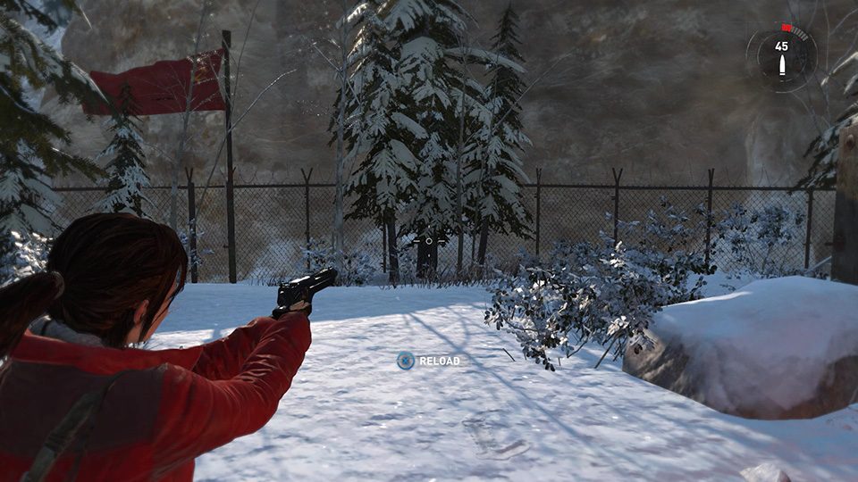 Press and hold to draw the currently selected weapon. Then move the mouse or right stick to aim. NOTE: There's a limited auto-aim feature if you set the combat difficulty to Adventurer (Easy). Each time you release Aim and then press it again, Lara will automatically aim at a nearby target. If that helps, by all means use it, but I found it easier to just re-train myself to use the stick/mouse to aim. Later in the game, when you're besieged by multiple enemies, you'll need to be able to do this. |