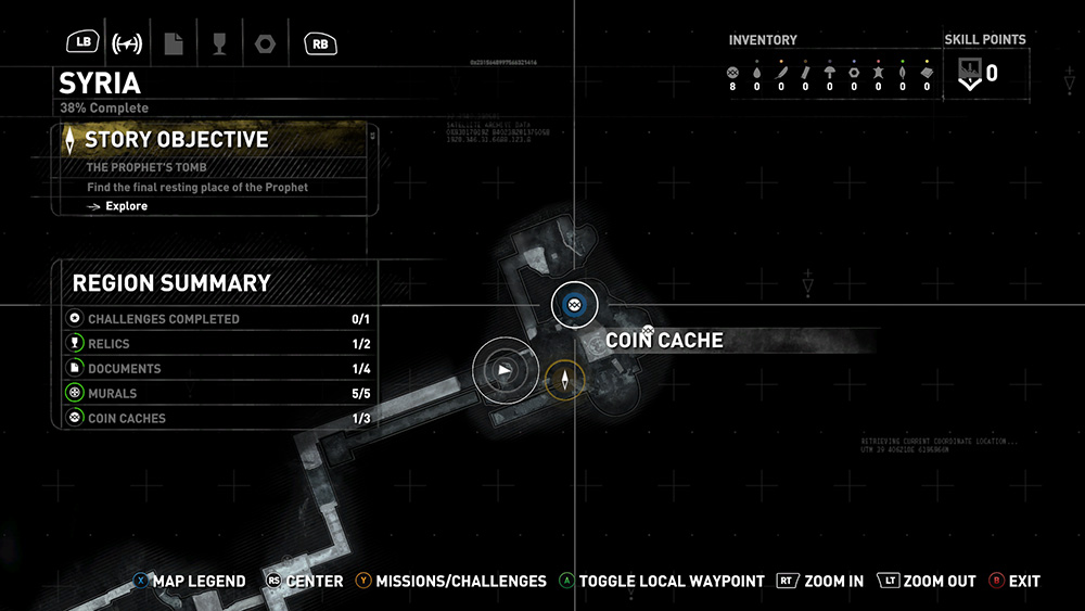 The map screen shows Lara's current location and also contains various information about your mission status, collectibles, challenges completed, etc. See the Map/Objectives section below for more on using the map, setting player beacons, etc. |